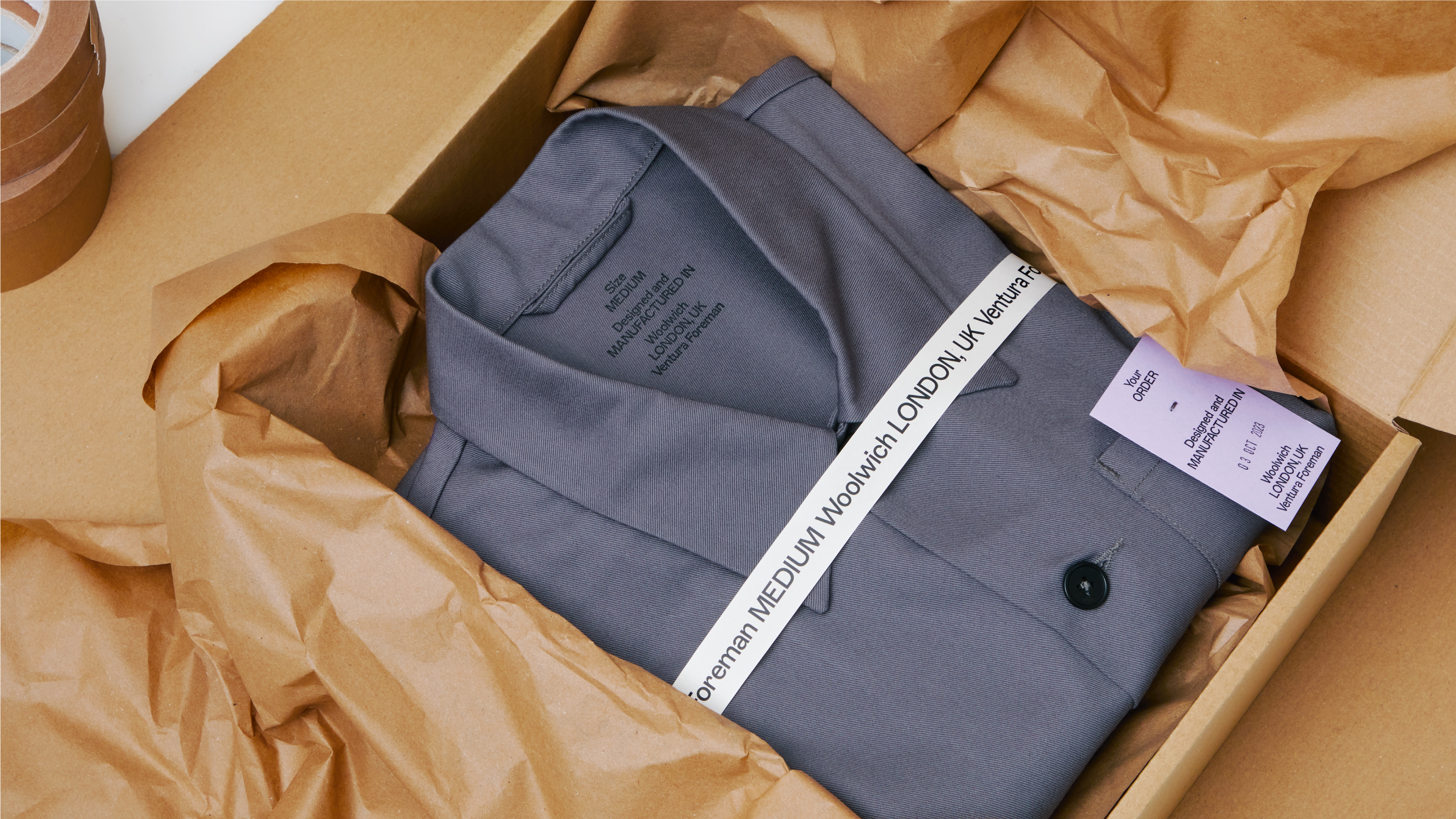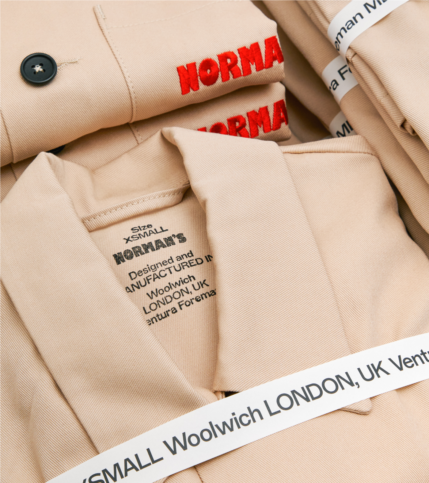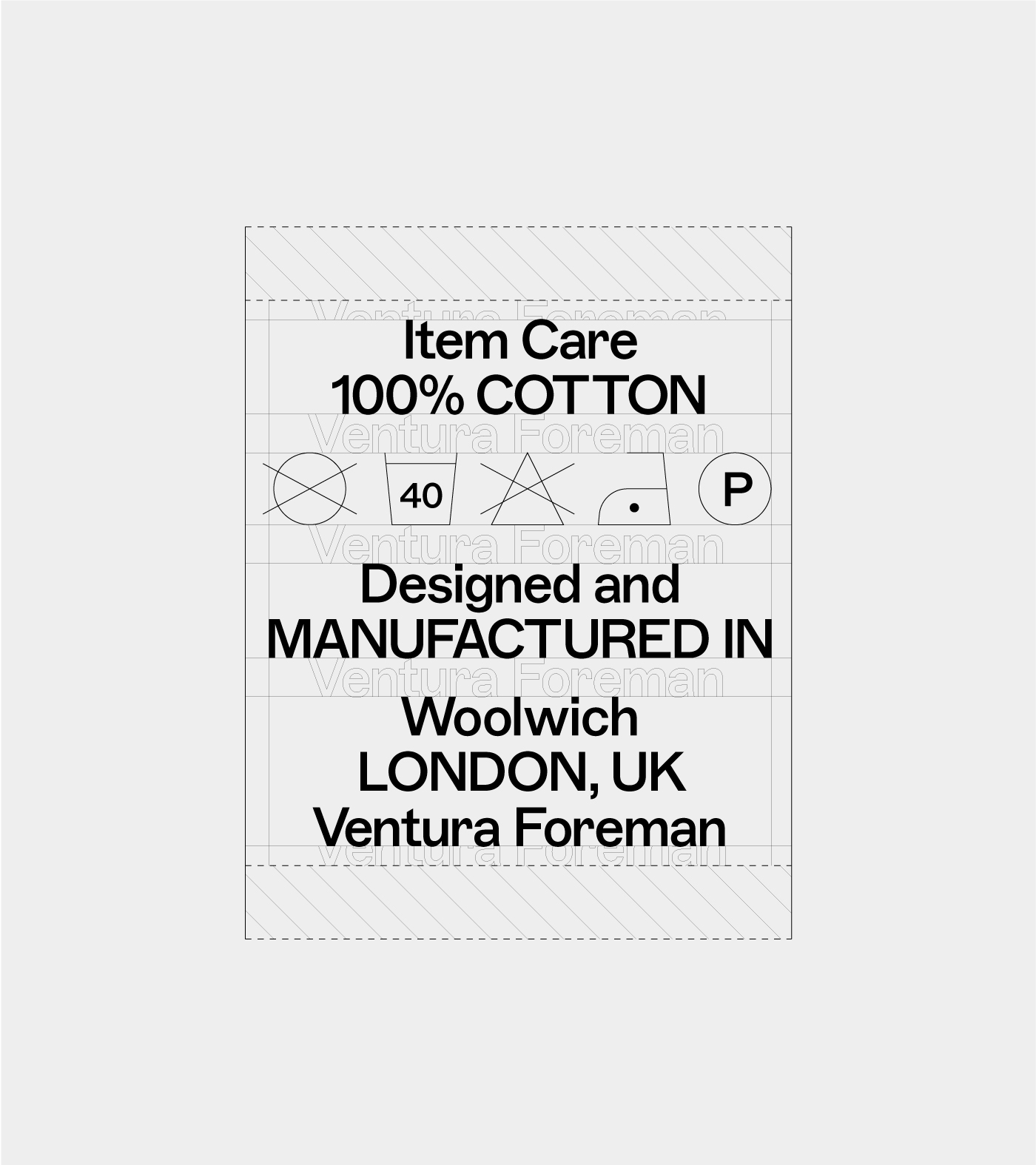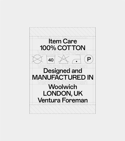 This feeling of ‘a little bit wrong’ was applied to everything, from the typographic system for the logo to the way we attach a label. It even aided us with the choice of typeface, ABC Marfa Medium, designed by Dinamo® which was created as a sturdy, utilitarian typeface designed for a high-speed era with no time to lose, and has subtle quirks that felt wrong—but so right—for Ventura Foreman.