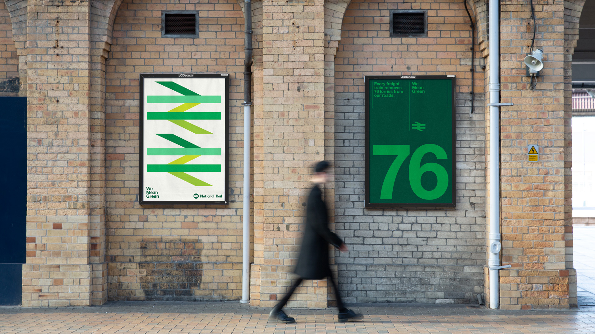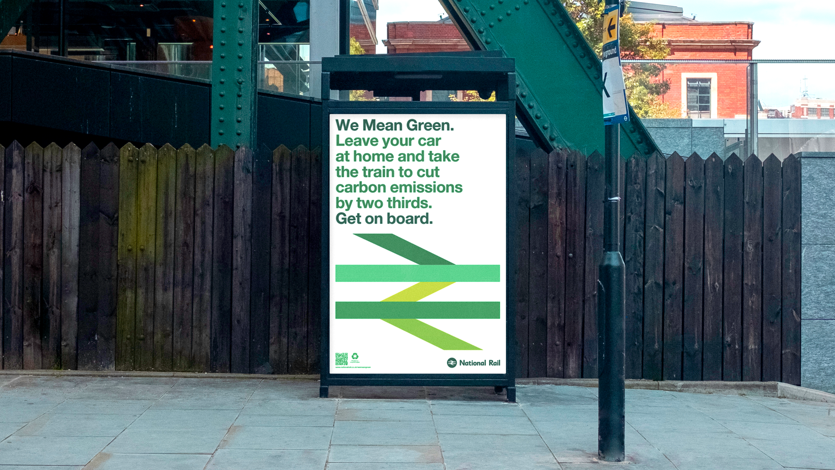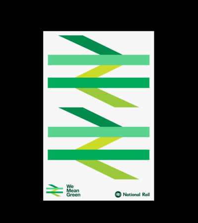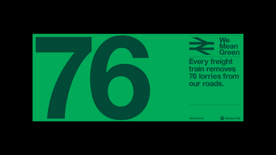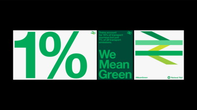 The eight week campaign uses a colour adaptation of the Britain Runs on Rail logotype — originally adapted from Gerald Barney’s 1965 double-arrow logo by M&C Saatchi. It simultaneously draws on the heritage and recognition of the past but — more importantly — draws attention to the environmental benefits of rail travel over other forms.